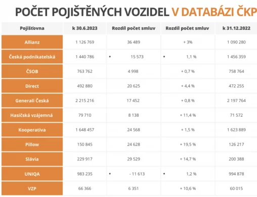 Počet pojištěných vozidel stále stoupá. Podle aktuálních statistik České kanceláře pojistitelů (ČKP) mělo povinné ručení v lednu tohoto roku poprvé v historii více než 9 milionů vozidel. Za první pololetí 2023 přibylo 145 555 vozů se sjednaným pojištěním odpovědnosti z provozu vozidla. „Celkový počet pojištěných vozidel v České republice ke 30. 6. 2023 činí 9 198 129 vozidel, což představuje nárůst o 1,6 %. Nejvyšší růst zaznamenaly pojišťovny Pillow a Slavia – Pillow pojistila 150 845 vozidel, což je téměř 20% nárůst ve srovnání se zimními výsledky. Slavia eviduje 229 917 pojištěných vozů, což je o 29 529 vozidel více než na konci roku 2022,“ uvádí Irena Jakobová, specialistka ze společnosti FinGO.