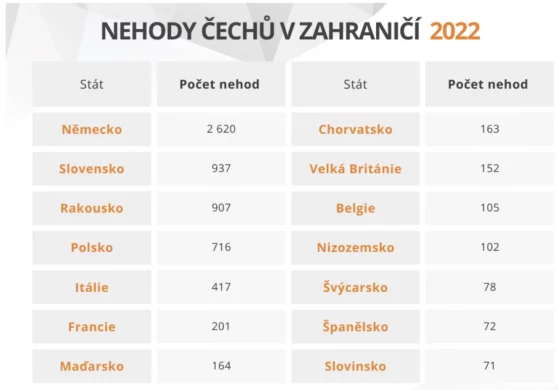 Aktuálně míří až 53 % Čechů na dovolenou do zahraničí autem. Data ČKP ukazují, že Češi způsobili v zahraničí za rok 2022 celkem 7028 nehod. „Nejvíce nehod způsobili Češi v Německu, a to 2620. Na druhém místě se umístilo Slovensko se 937 nehodami a třetí místo obsadilo Rakousko se 907 nehodami. V Čechy dlouhodobě oblíbeném Chorvatsku bylo zaviněno 163 nehod,“ říká Petr Jedlička, pojistný matematik České kanceláře pojistitelů.
